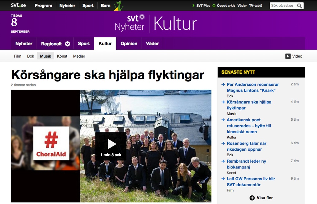Vi är stolta och glada över att vår kampanj #ChoralAid har blivit uppmärksammad i rikstelevisionens Kulturnyheterna på SVT1 under tisdagskvällen.